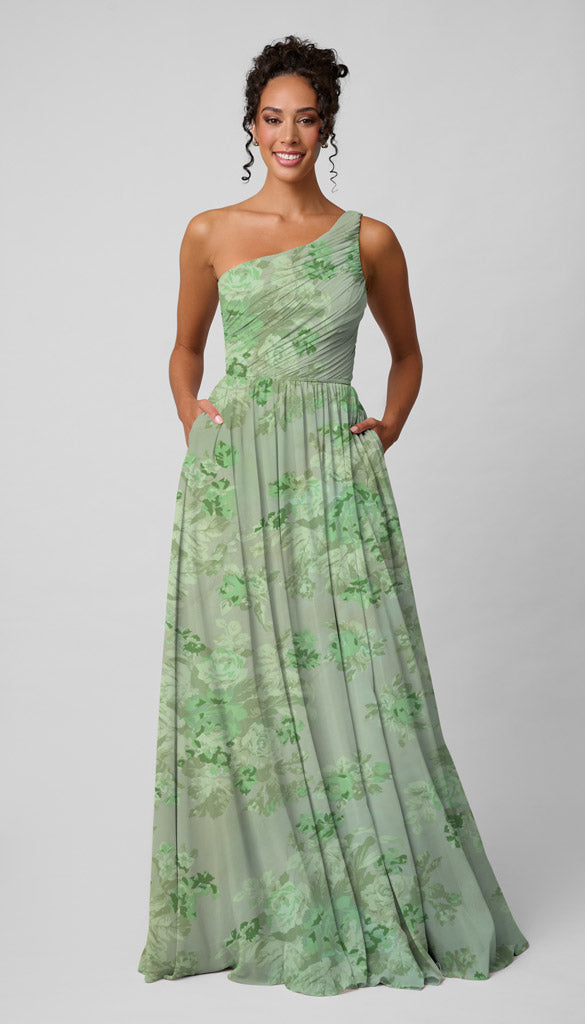Athena Platinum features an elegant ruched bodice paired with a flattering one shoulder neckline, offering a timeless and refined look. Crafted from luxurious chiffon, this dress provides full coverage without compromising on style, ensuring your bridesmaids feel both confident and stunning for any wedding occasion.