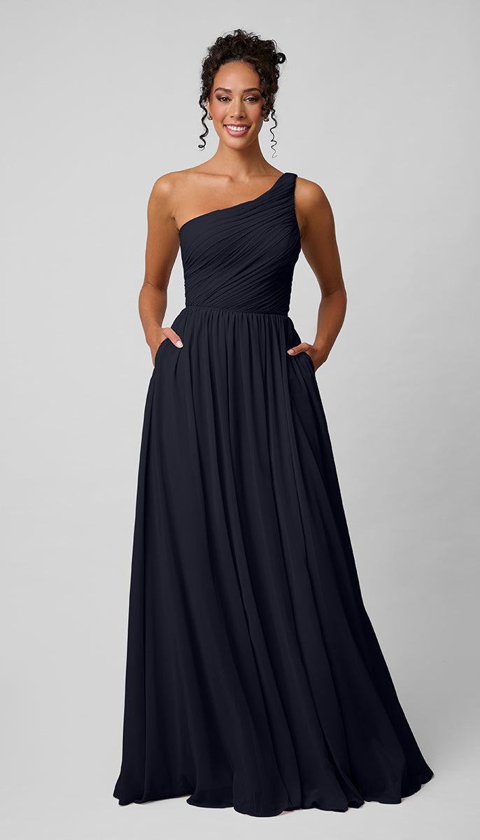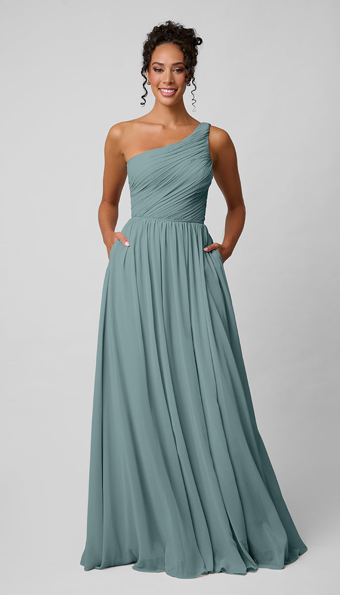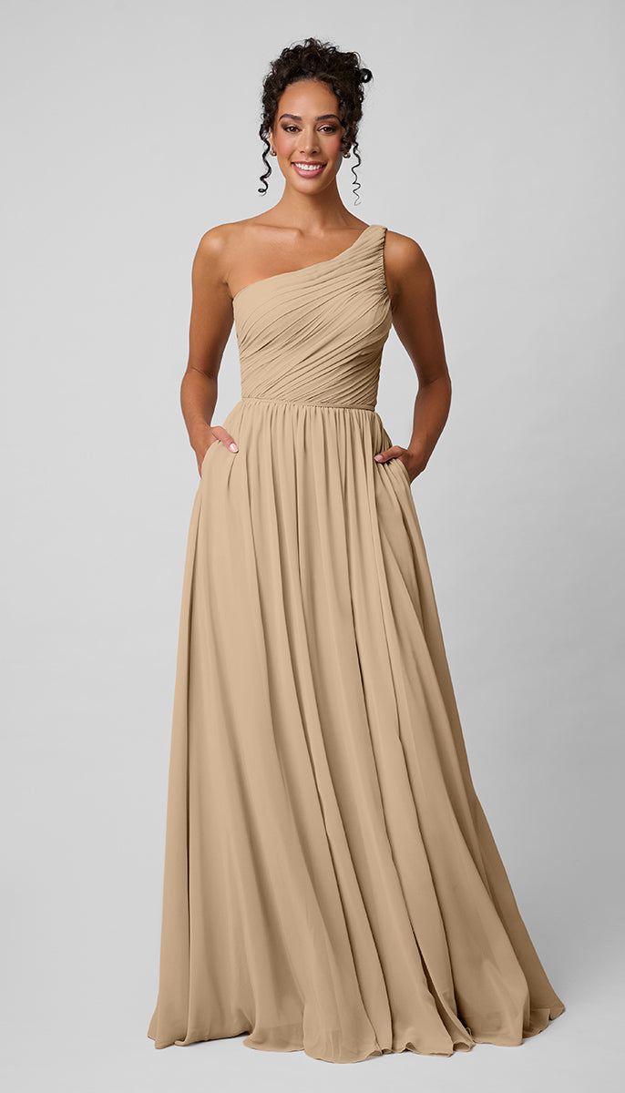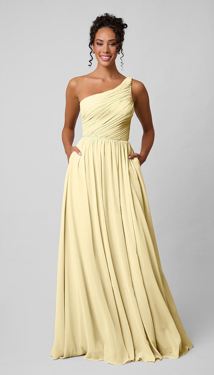 Athena Platinum features an elegant ruched bodice paired with a flattering one shoulder neckline, offering a timeless and refined look. Crafted from luxurious chiffon, this dress provides full coverage without compromising on style, ensuring your bridesmaids feel both confident and stunning for any wedding occasion.